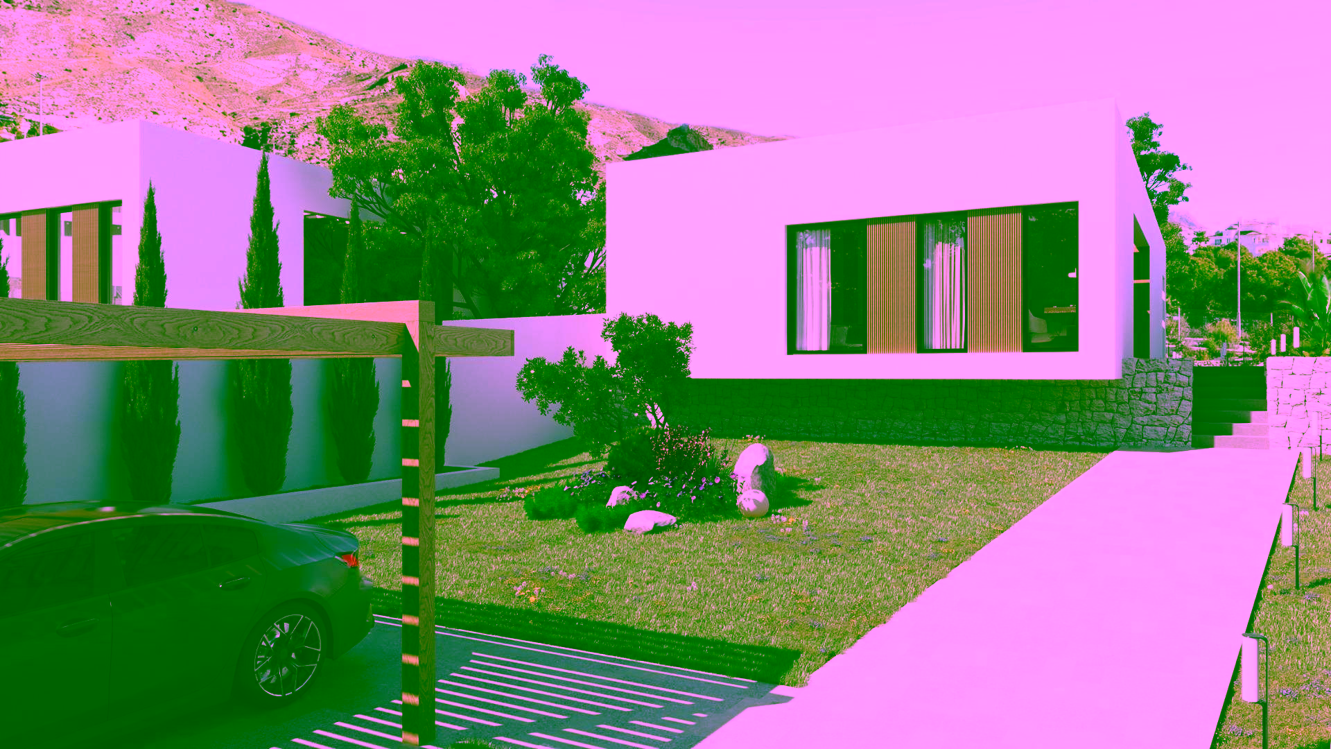 Every villa is conceived as a peaceful oasis, featuring modern architecture and natural elements. The entrance welcomes you with a wide, elegant driveway and a covered carport. A landscaped garden filled with native plants and blooming trees sets the tone for a tranquil lifestyle.