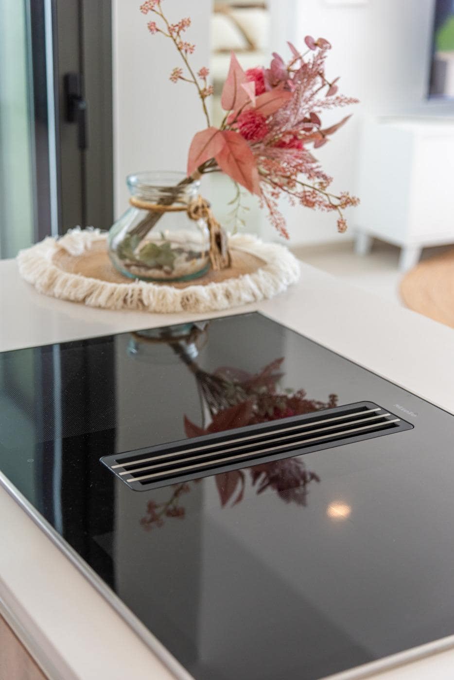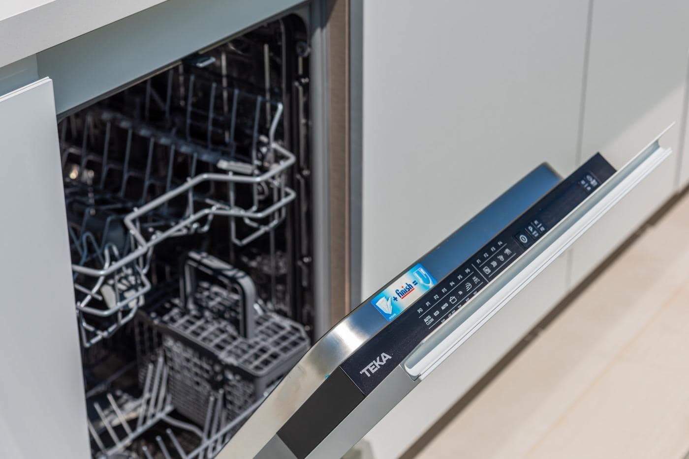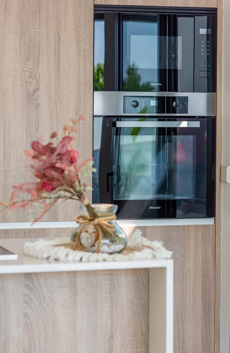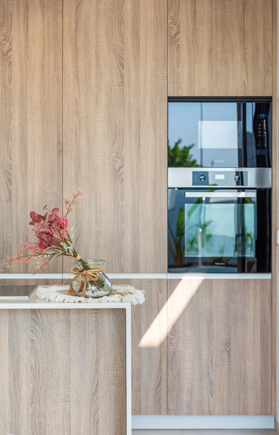 Fully fitted kitchen in white gloss or wood colour. Technological quartz. Stainless steel sink. Induction hob with integrated extractor, oven, microwave, washing machine, integrated fridge, integrated dishwasher.