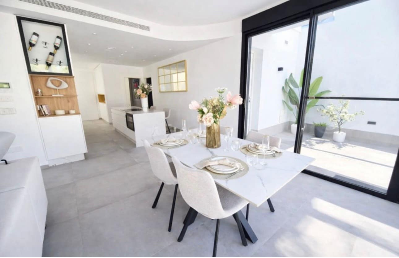 Looking for a modern new build, but do not want to wait for it to be built? Look no further as we are excited to list this stunning RESALE three bedroom four bathroom detached villa with pool and garage. Located just 950m from the beach in Santiago de la Ribera with all the amenities you could need just walking distance, public transport links with buses going to various locations including Murcia, Cartagena, Cabo de palos and Campoamor. There is also a ferry service over to La Manga Strip.On entering this stylish villa there is a hallway with a useful wardrobe which leads through to the open plan kitchen with an island and then through to the lounge which has large patio doors that open to the west facing garden which has a terraced area and a 28m2 heated pool. On this level is a double bedroom with walk through wardrobe and en suite bathroom and there is also a separate WC. Upstairs are two further double bedrooms also with walk through wardrobes and ensuites and both have patio doors to the first floor terrace which has stairs leading to the large roof solarium which has a summer kitchen and all day sun. This property has an integrated garage which has a door to the villa and a door to the garden. The property comes furnished, vented AC, anti solar glare glazing, automated mosquito blinds, and electric awnings. Do not hesitate to contact us to arrange to view this stunning villa.