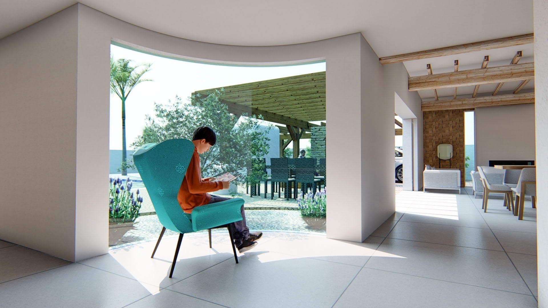 There is a massive large sliding window that is embedded on the wall when closed, connecting to a large pergola area that works as a buffer space in between the interior space and the pool terrace.