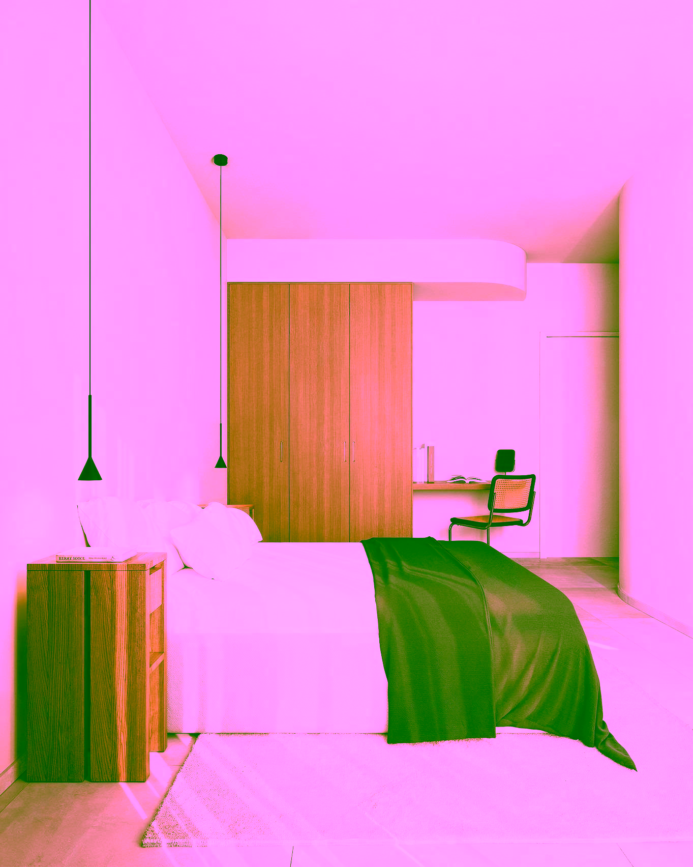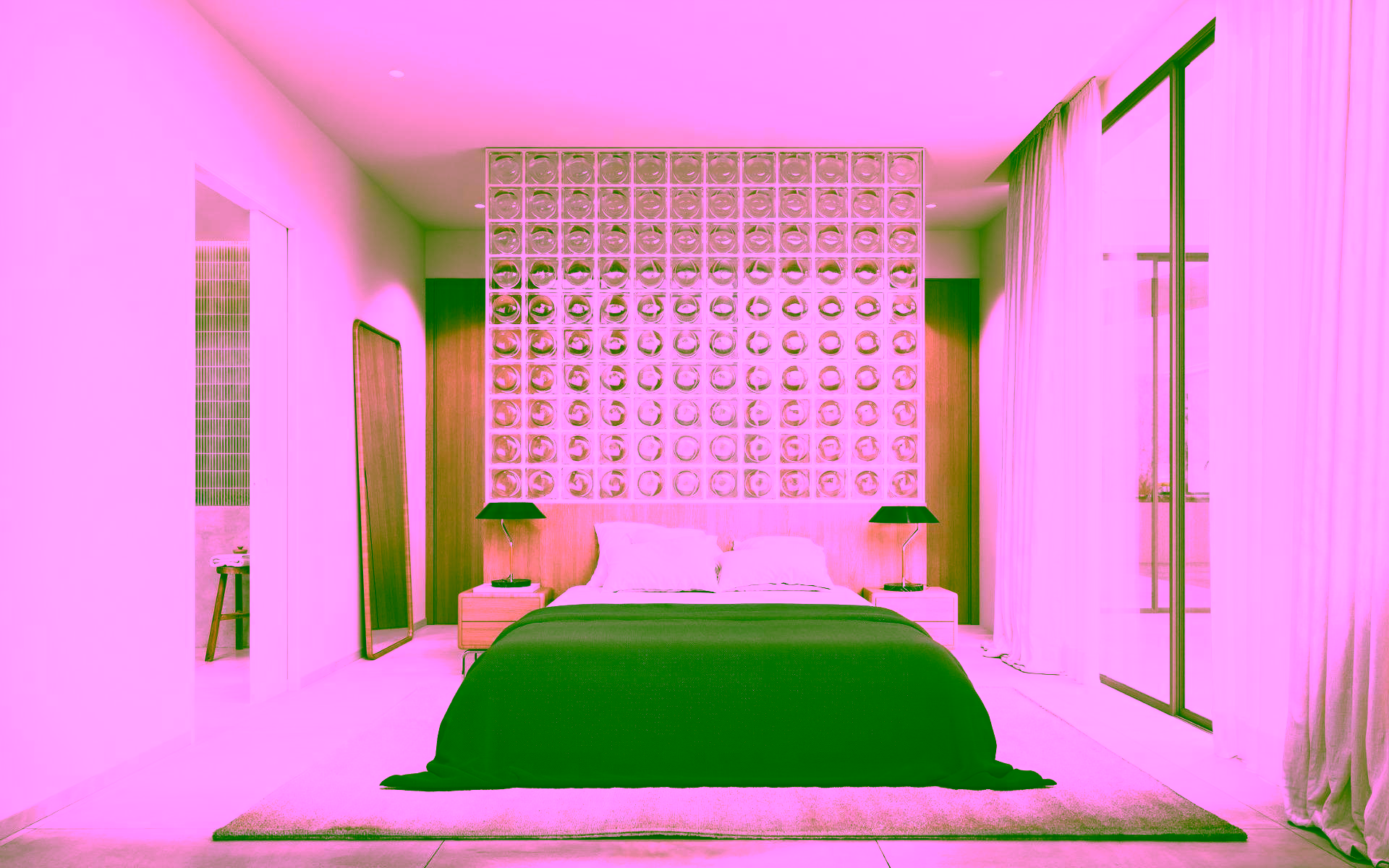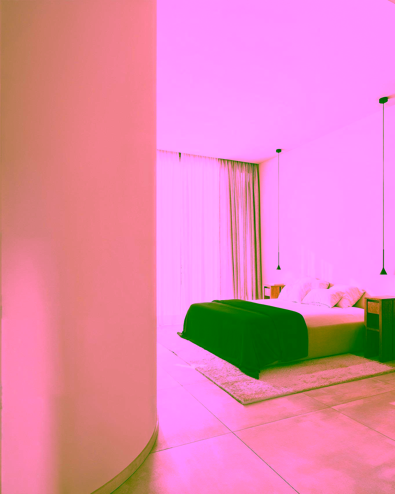 Motorized blinds in bedrooms.
