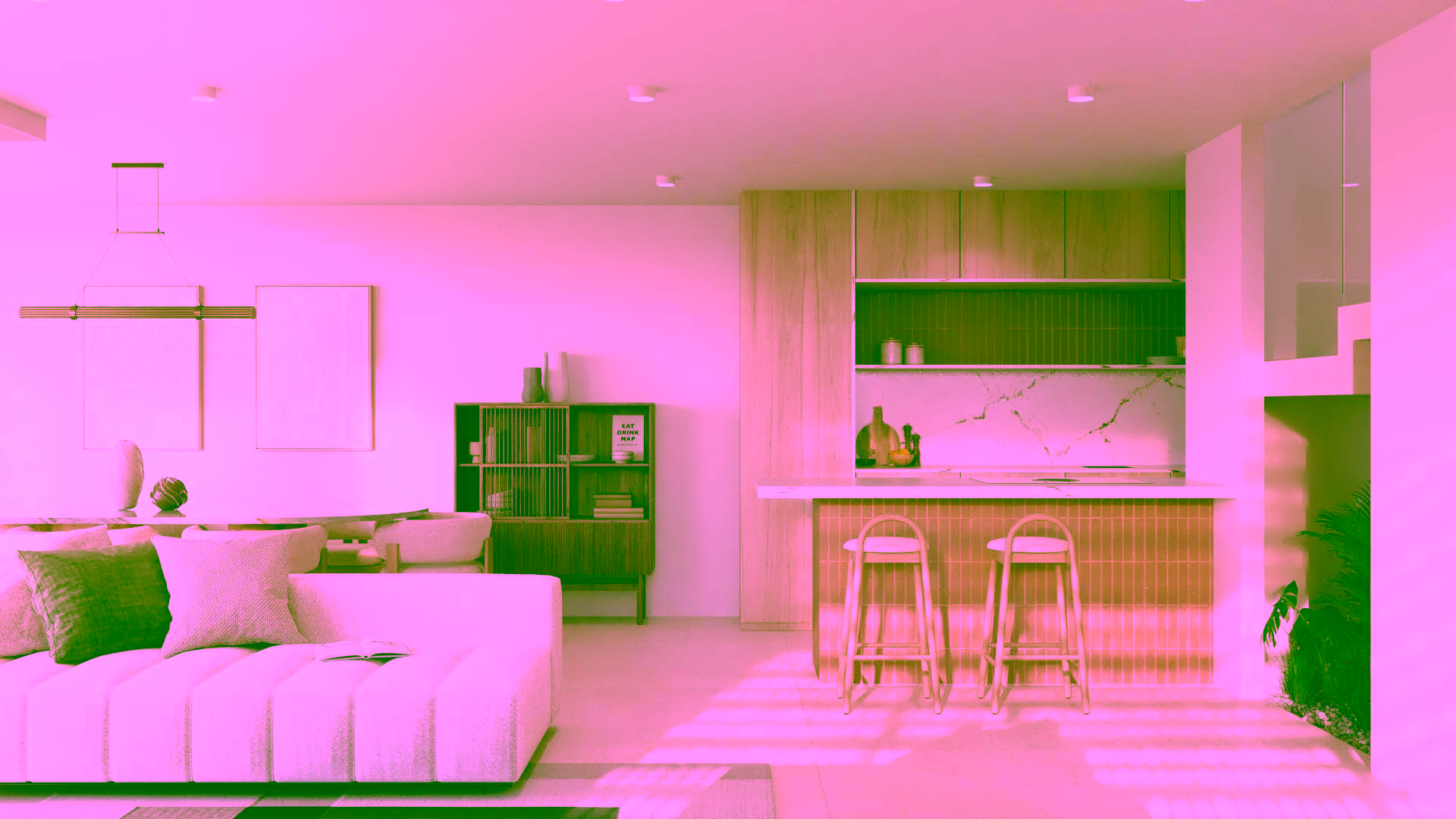 The ground floor includes a private closed garage, laundry area, a spacious living room with open plan kitchen, direct access to a covered porch and a beautifully landscaped front garden with an infinity pool overlooking the sea. There is also one bedroom and one bathroom on this level, ideal for guests or flexible living.