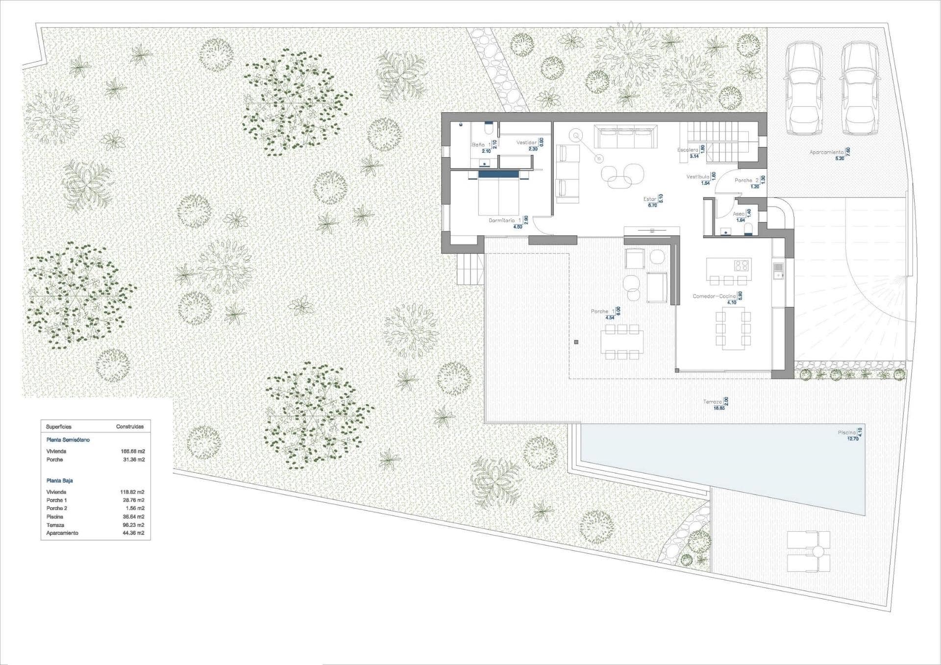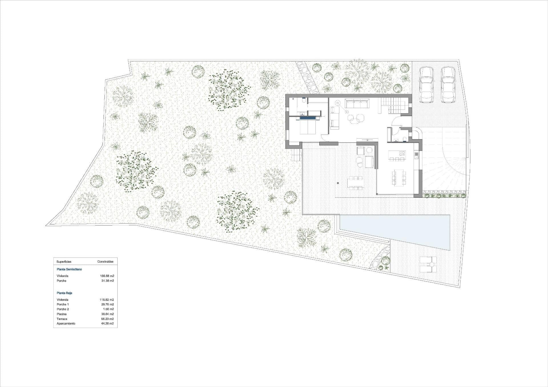 Parking: Spacious area for two vehicles, sheltered by a high-quality tensile canopy.