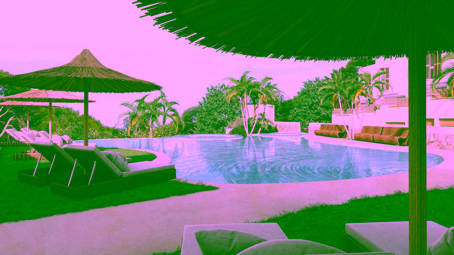 A ground floor with living-dining-kitchen, bathroom, bedroom and three terraces: front terrace, side terrace with private pool and barbecue, and rear terrace overlooking the communal pool.