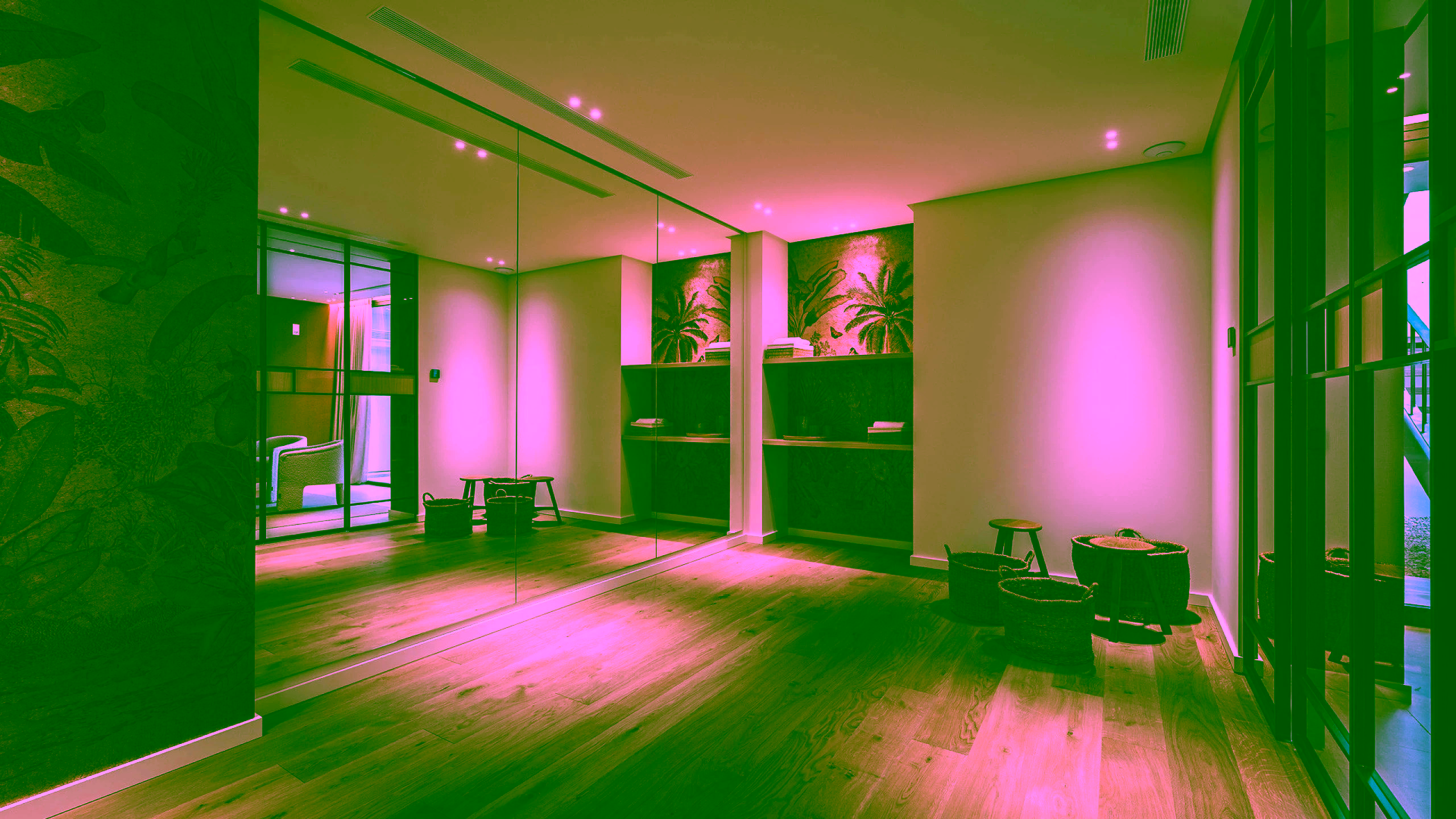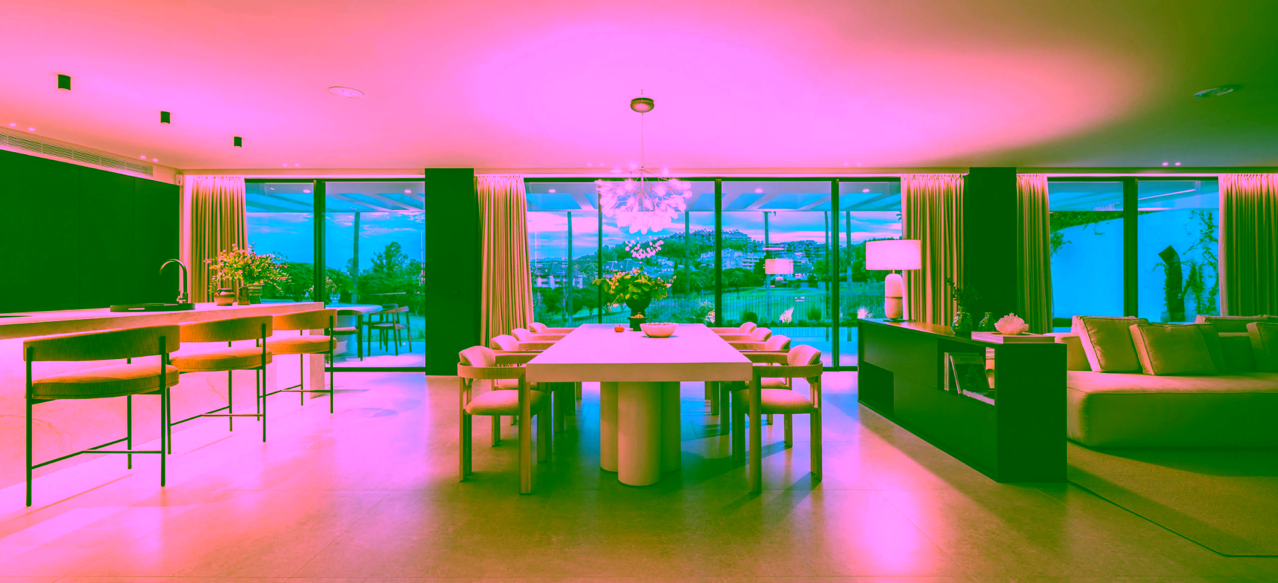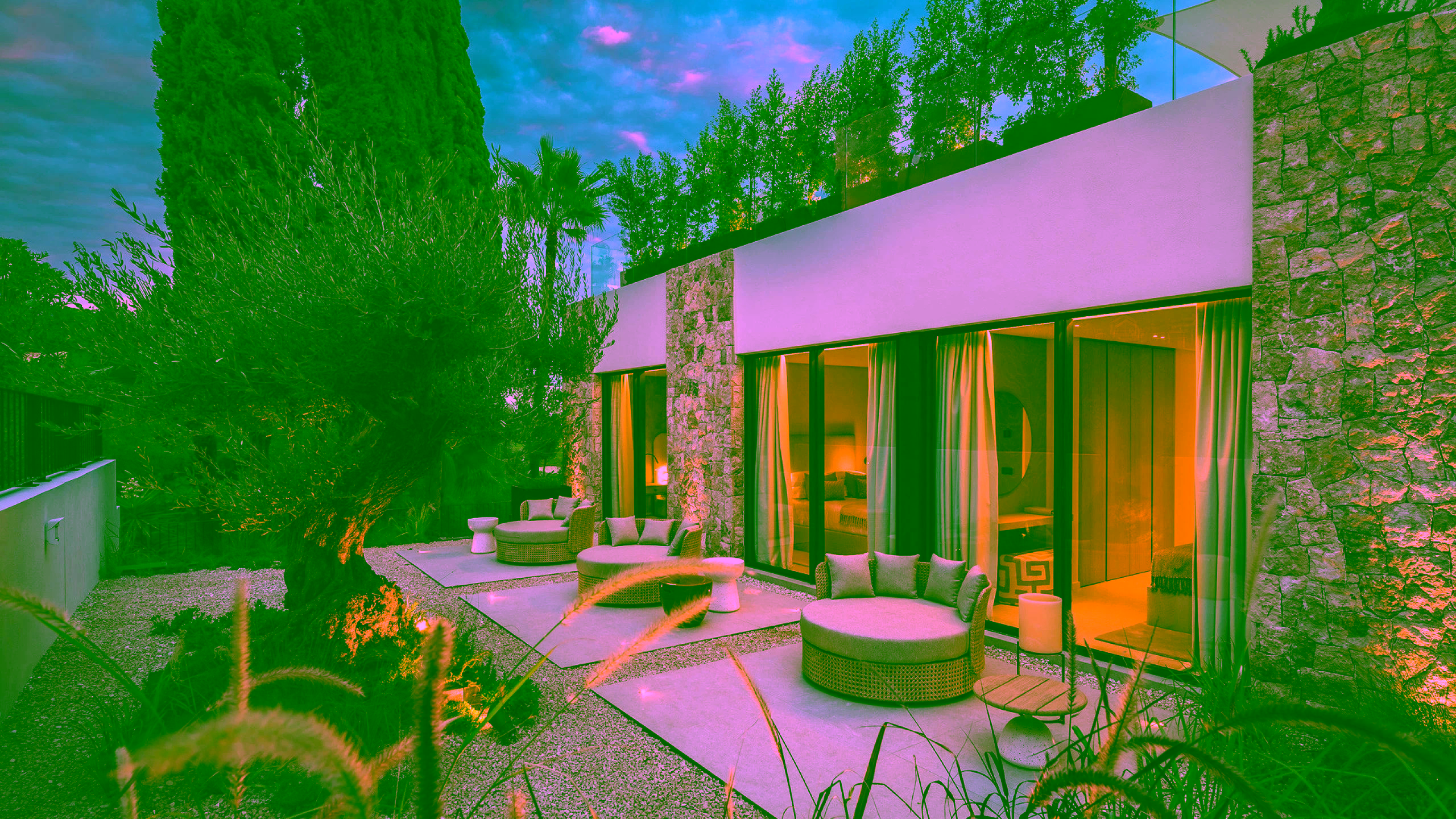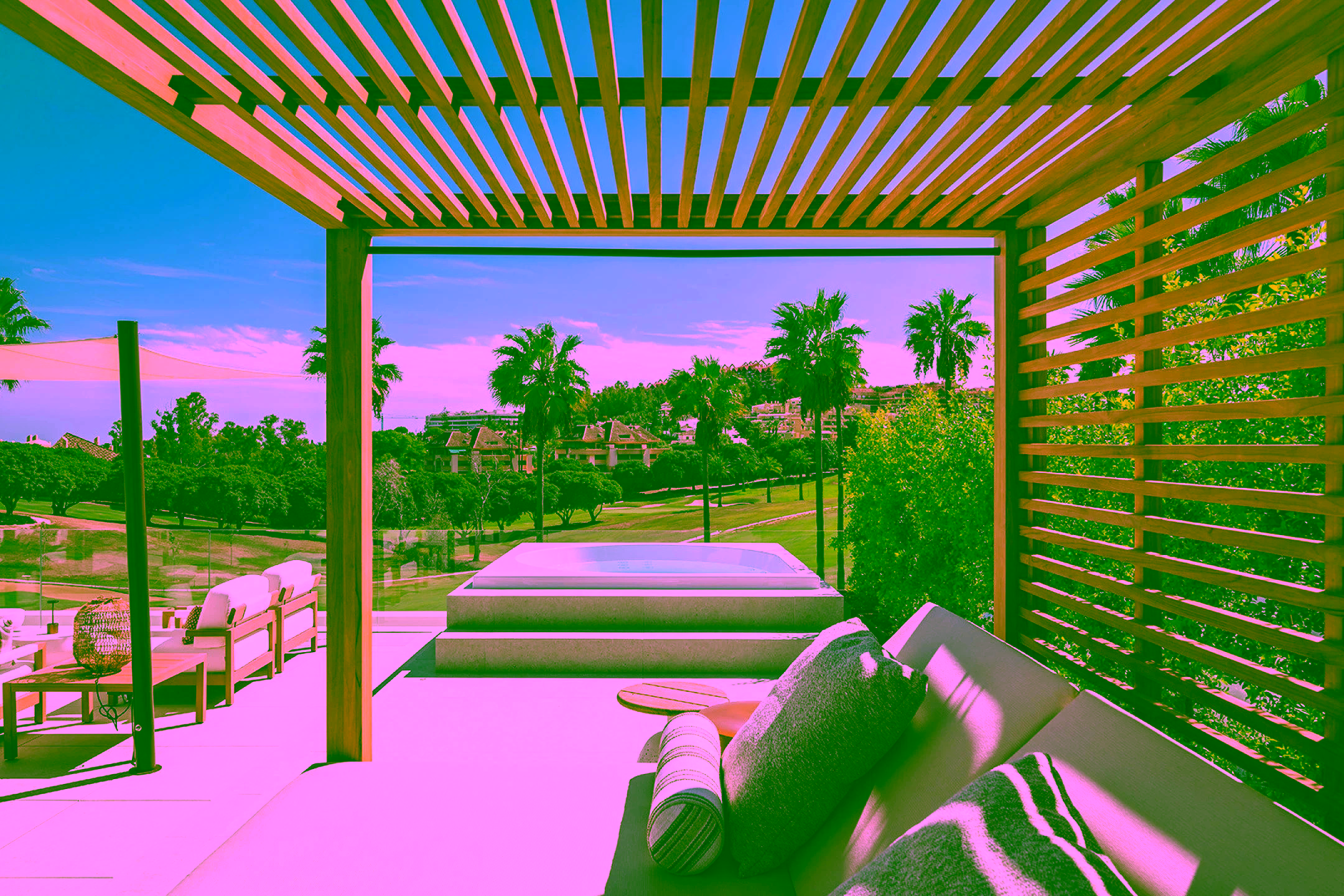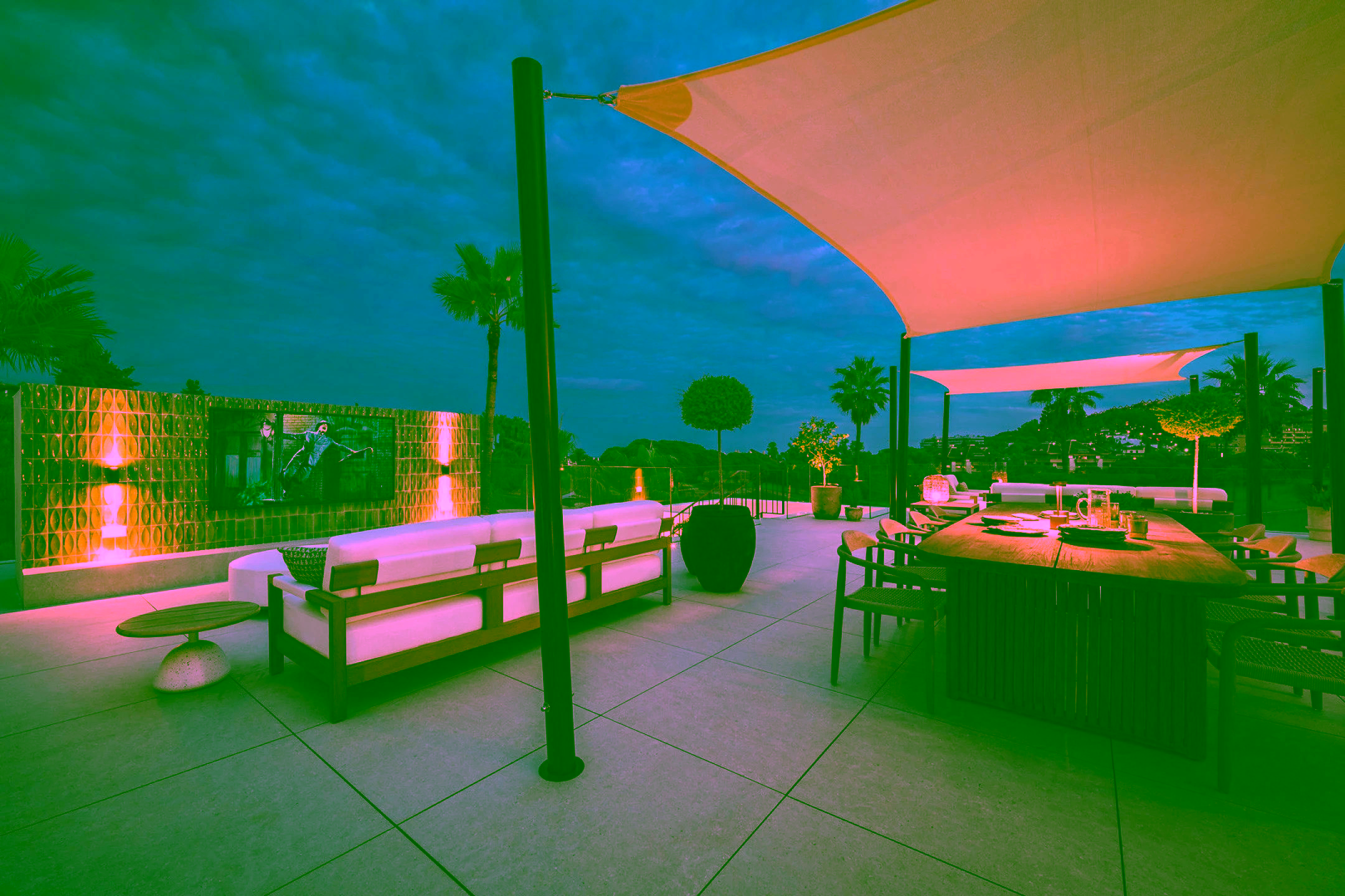 The roof terrace is every entertainers dream. Here you will find the outdoor kitchen, seating and dining areas, outdoor cinema and the villas jacuzzi All offering amazing views over the golf course and valley. In the basement there is a gym dressed in dark wooden walls and ceiling as well as the home office.