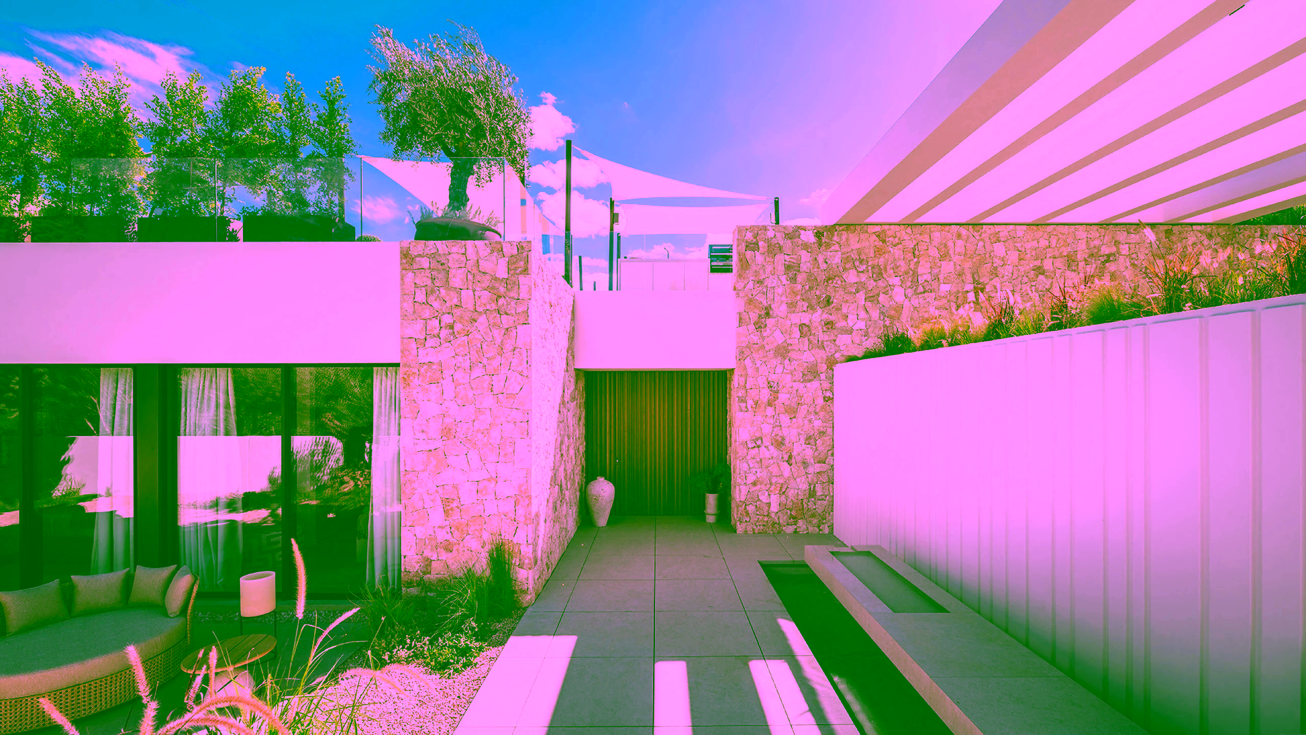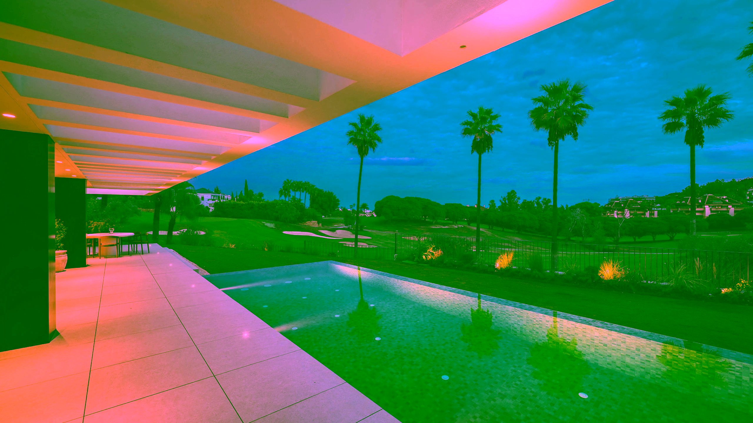 Furthermore, on this level there is 4 bedrooms, all en-suite and with its own terrace. The master bedroom with its almost 40 m2 includes a walk-in closet and designer bathroom in an open plan to create that luxurious suite feeling. The pool area and terrace offer several lounge areas and water features nicely connected with the pool. Here is also a buggy garage with direct access to the golf course.