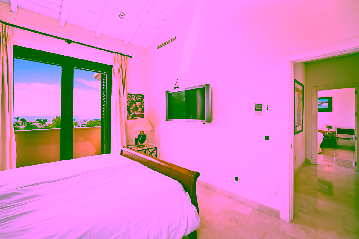 All the main living spaces on the ground floor have direct access to the generously sized terrace, a beautifully landscaped private garden, and a sparkling swimming pool. These outdoor spaces provide breathtaking panoramic views of the Mediterranean Sea and the lush golf course, creating a serene and picturesque setting. The first floor of the villa is dedicated to restful living. The master suite is a true sanctuary, featuring impressive vaulted ceilings, a luxurious en-suite bathroom, and a spacious walk-in closet.
