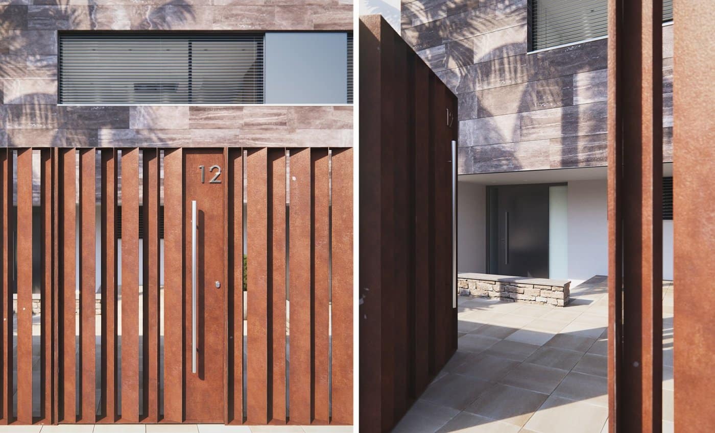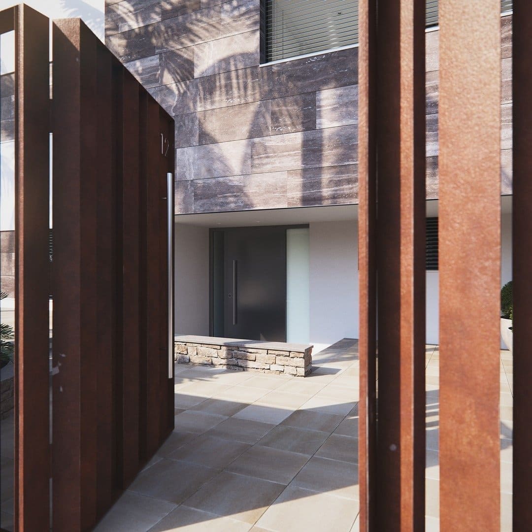 The access gates to the garden and garage are automated with infrared remote control. Garage for two vehicles and outdoor parking for an additional vehicle.