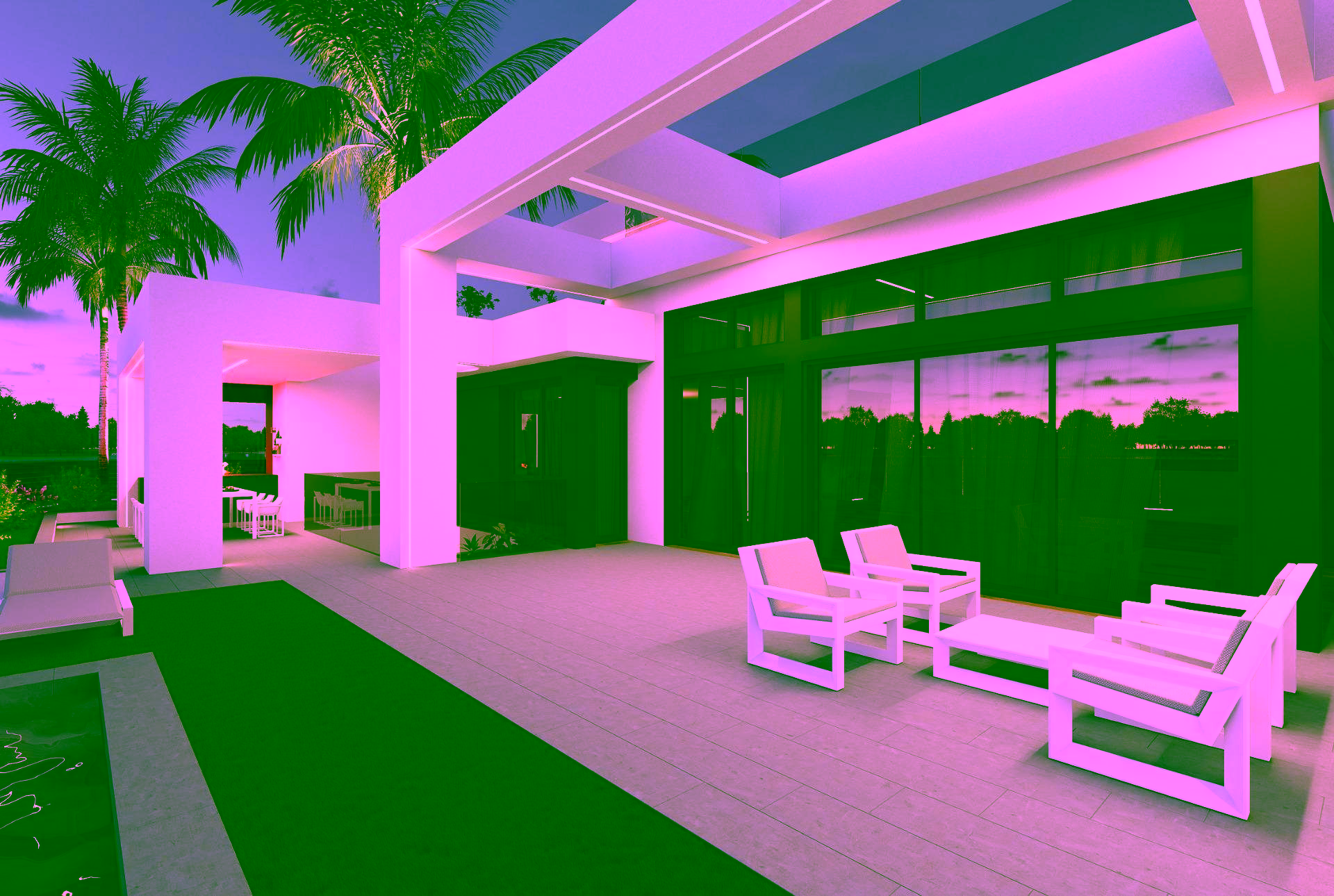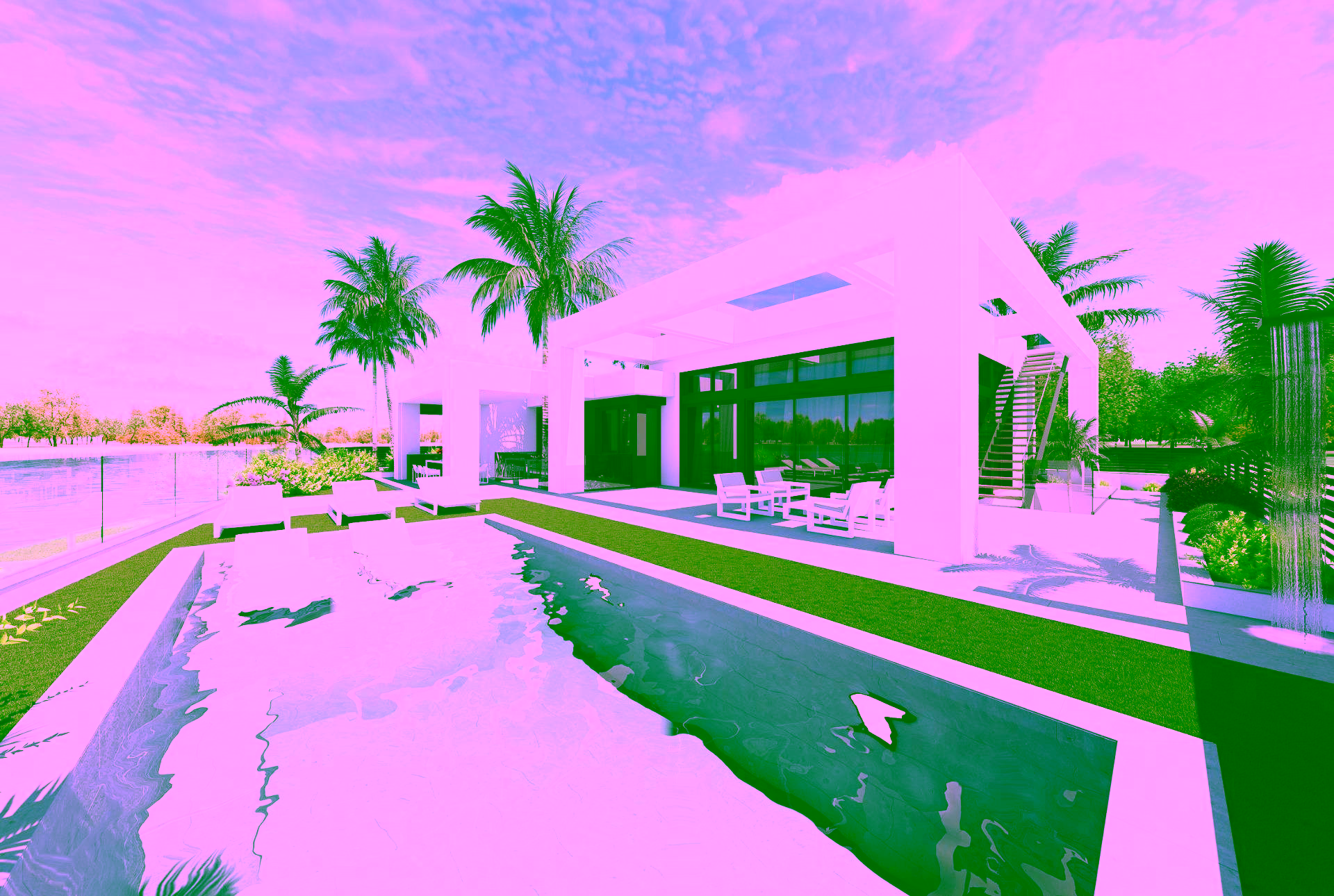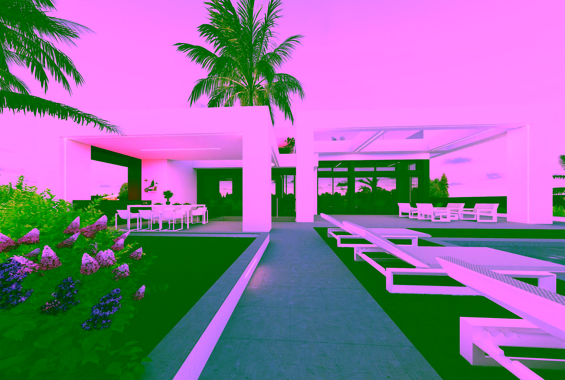 Finished garden with artificial grass, palm tree, shrubs, and drip irrigation system