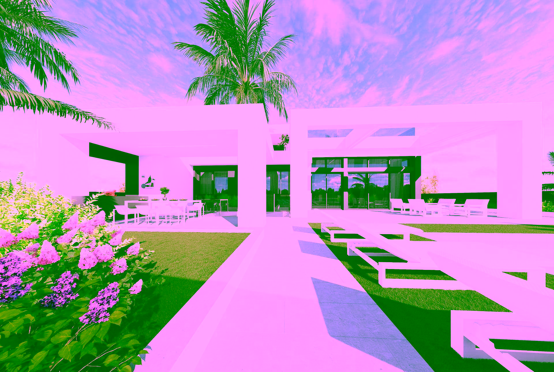 Finished garden with artificial grass, palm tree, shrubs, and drip irrigation system
