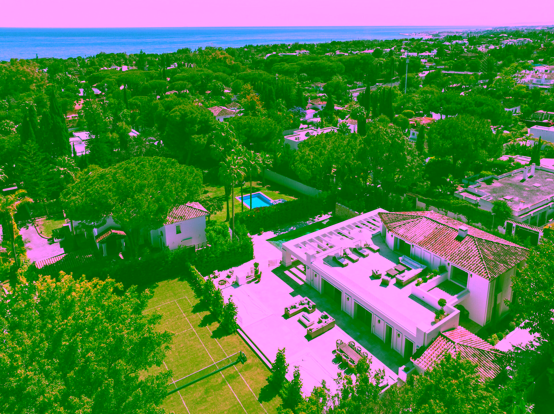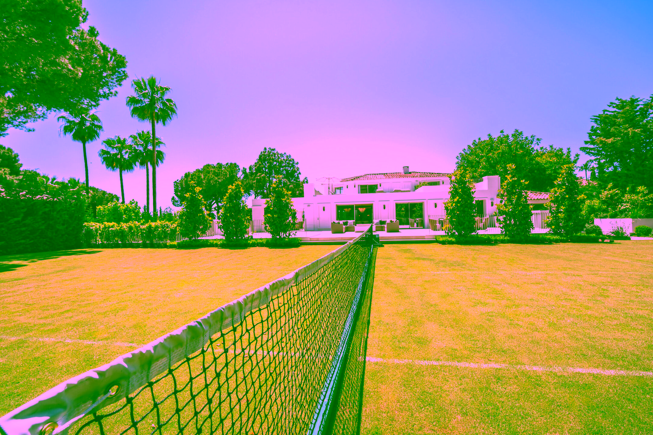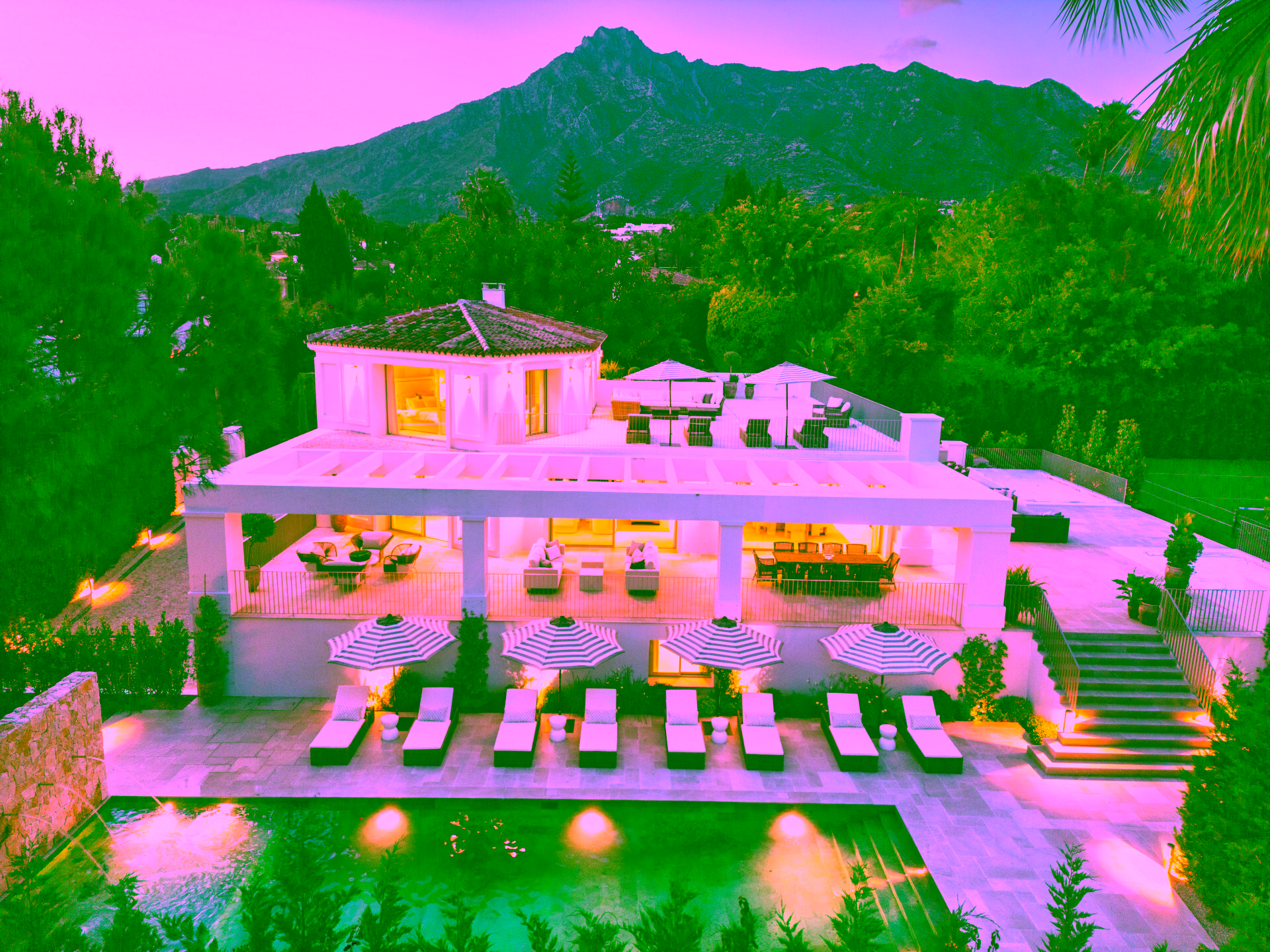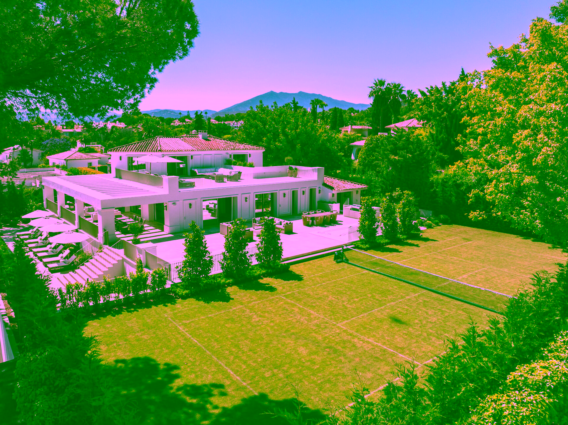 Positioned on a flat 2,370 m² plot with 712 m² of internal space, the villa combines sharp architectural lines with warm natural materials and traditional touches, creating a timeless and inviting character. Expansive glass doors open to landscaped gardens, a large swimming pool and multiple outdoor dining and lounge areas. The property also enjoys impressive views of La Concha mountain. It stands out as one of the only homes on the Golden Mile with a full-size private grass tennis court.