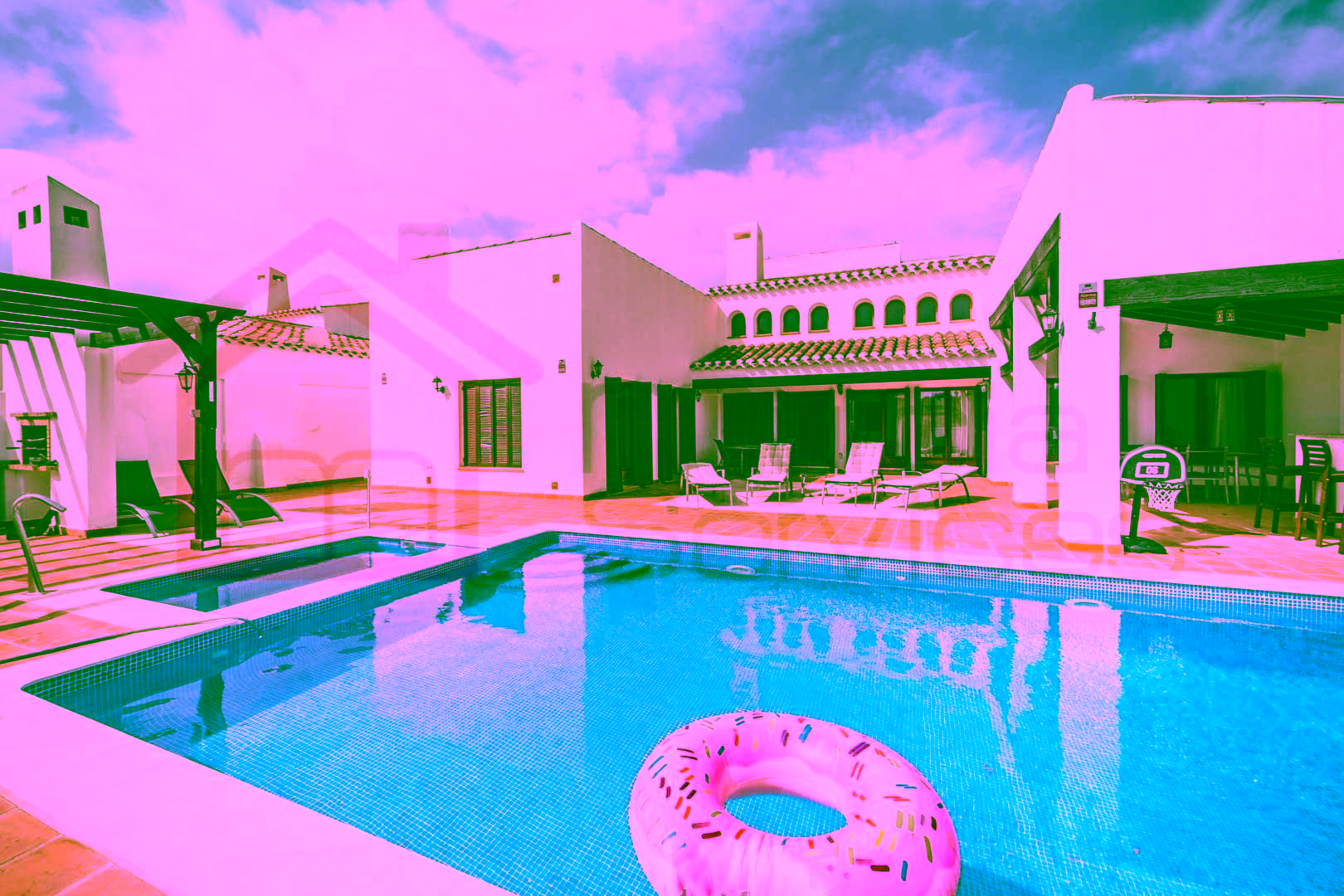 Presenting this 4 bed 3 bath Villa Algaba with private pool on El Valle Golf Resort.Entering the villa you come into a large living/dining area with high wooden beamed ceilings.To one side you have the fully fitted kitchen with a utility room.