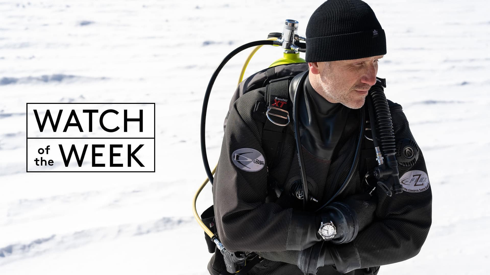 Diving is notoriously hard on equipment, ice diving much more so. Valves stick, lubricants thicken, masks fog, and everything becomes coated with a stiff layer of frosty rime. Besides simply finding ways to stay warm, there’s the constant concern of free-flow, where your regulator freezes open and gushes air, emptying a tank in a minute or two. To complicate matters, I was taking a large submersible camera rig under the ice. The last thing I wanted to think about was my watch. I just needed it to work. Ice diving is typically limited by time, not by depth or no-decompression limits. It’s simply too cold to linger, and the interesting scenery is the underside of the ice sheet above, not the lifeless, dark lake bed below. So we agreed on 25-minute maximum dive times, our radius of exploration set by the 100-foot safety rope, our connection to the hole in the ice and the relative safety of the surface. I left my dive computer behind, relying solely on my Omega to track elapsed time and my pressure gauge for the all important air remaining in my cylinder. I spun the bezel to zero out the arrow to the distinctive minute hand and slipped down, through the striated cut in the ice.